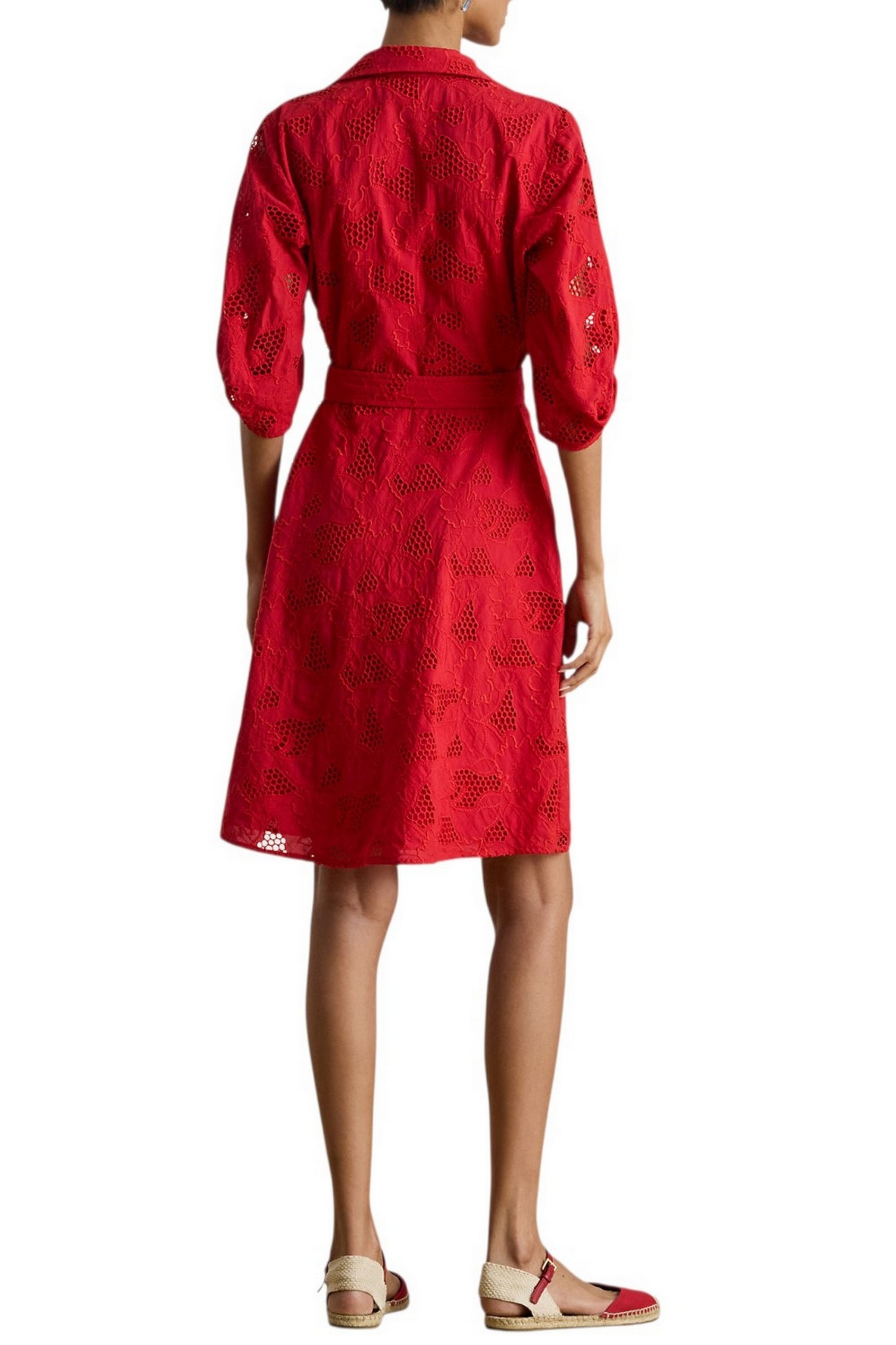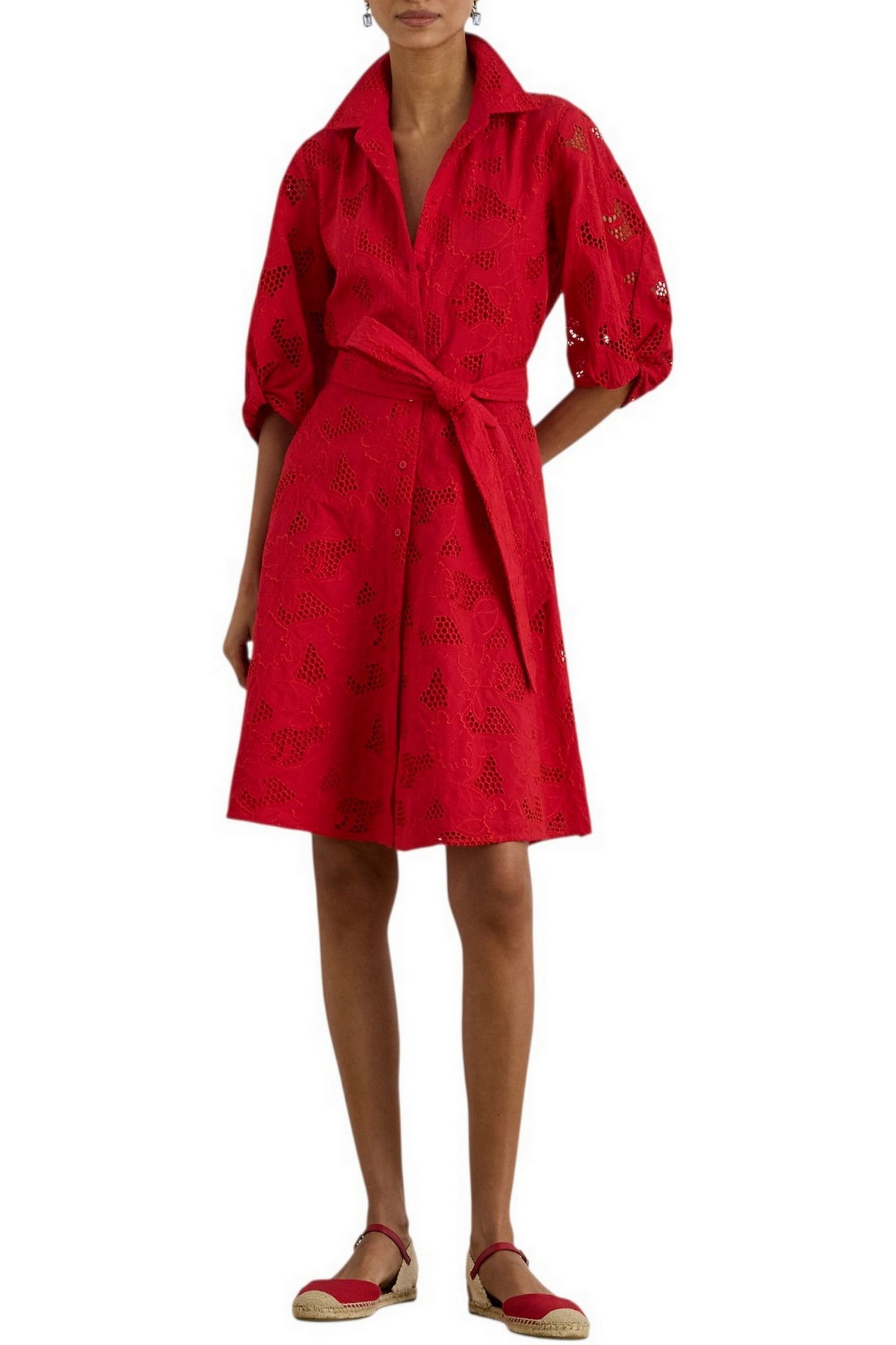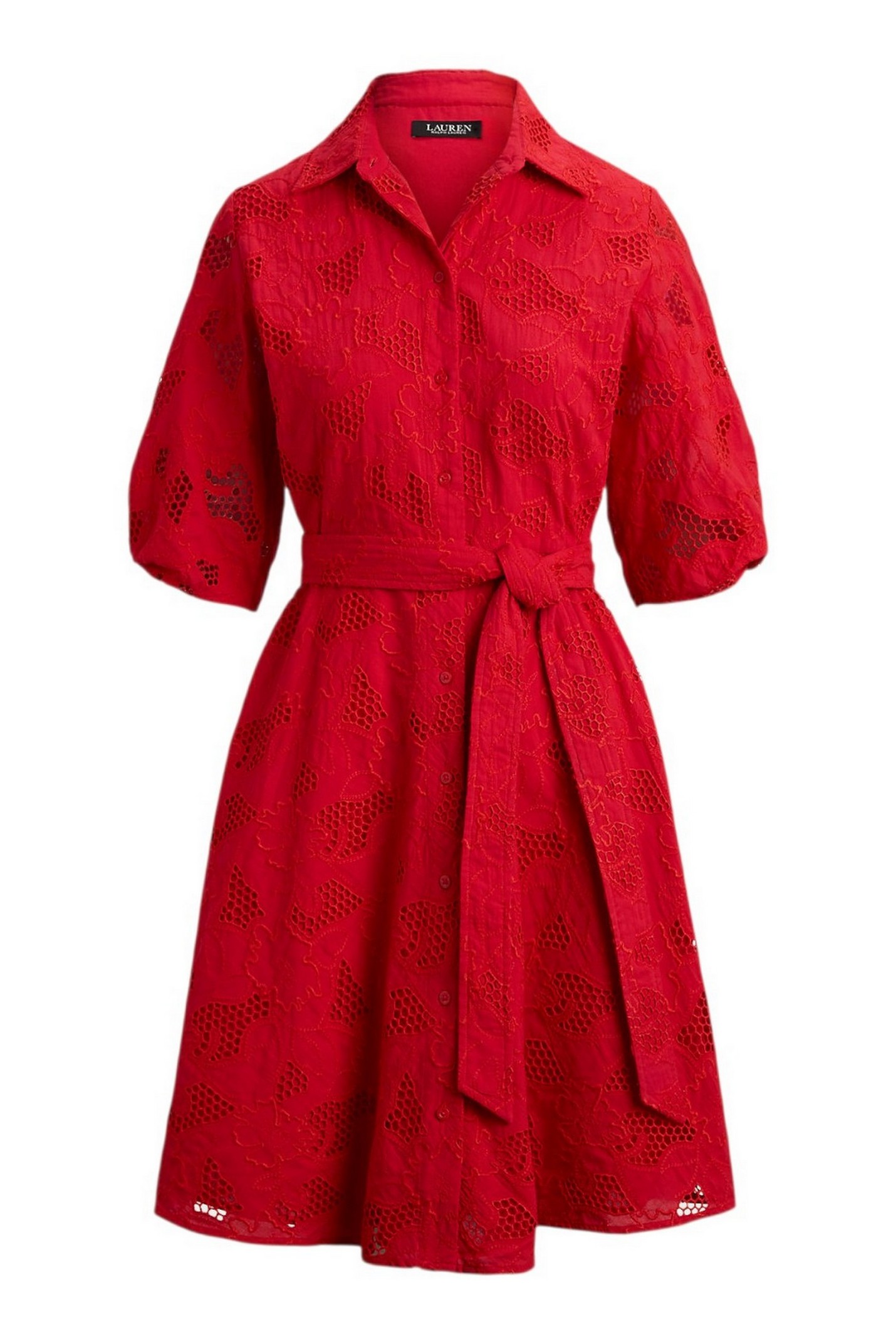 Abito chemisier femminile di Ralph Lauren realizzato in leggero voile di cotone, presenta ricami floreali traforati su tutta la superficie, voluminose maniche a palloncino e cintura in vita. Silhouette svasata. Lunghezza appena sopra il ginocchio. Colletto aperto. Abbottonatura con bottoni personalizzati con logo "Lauren Ralph Lauren". Maniche a sbuffo lunghe fino al gomito con polsini attorcigliati. Ricamo con occhielli su tutto il capo. Passanti per cintura. Dotato di cintura rimovibile. Completamente foderato tranne le maniche. Esterno e fodera: 100% cotone. Ricamo: 100% poliestere. Lavabile in lavatrice o a secco. La modella è alta 178 cm e indossa una taglia 4.