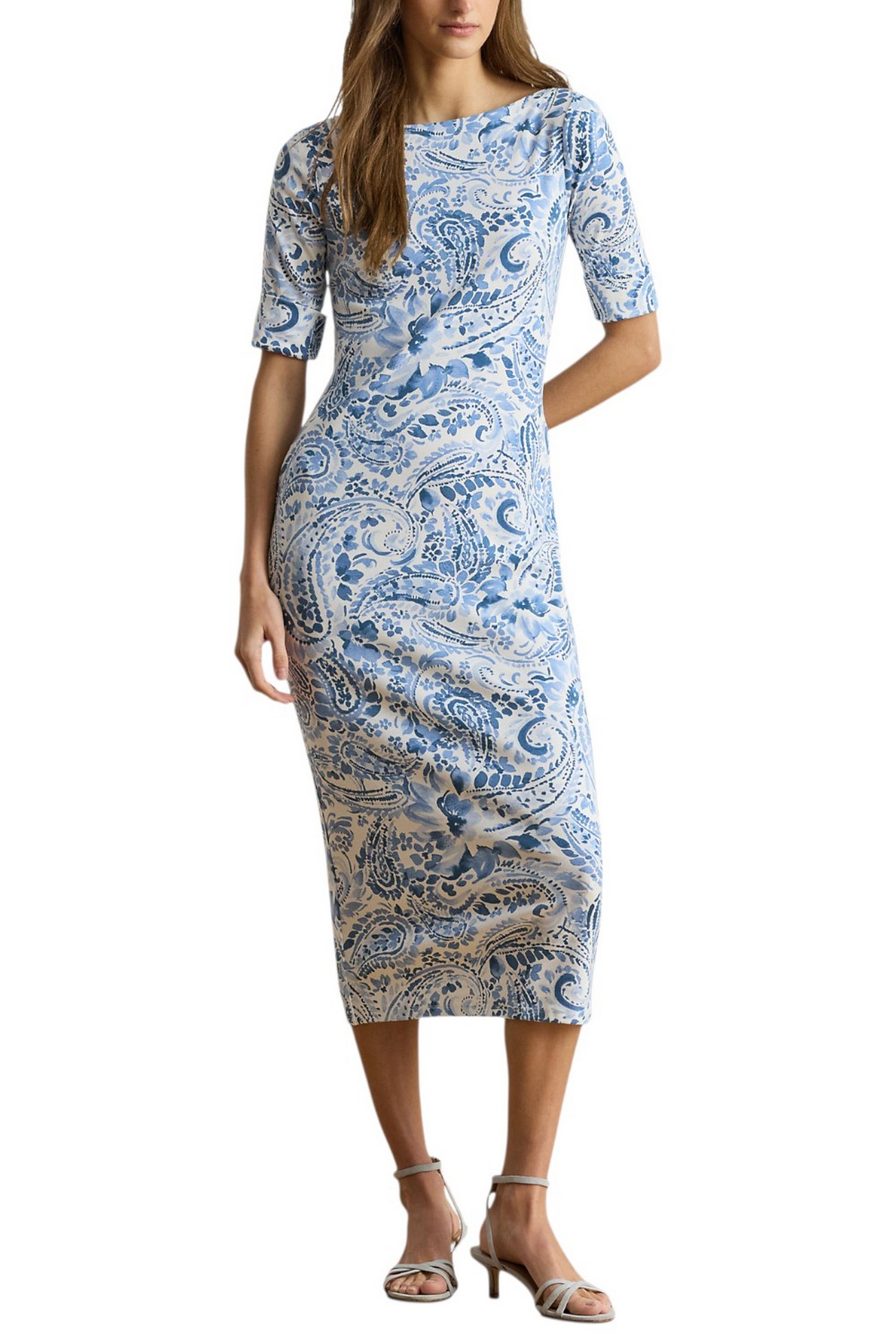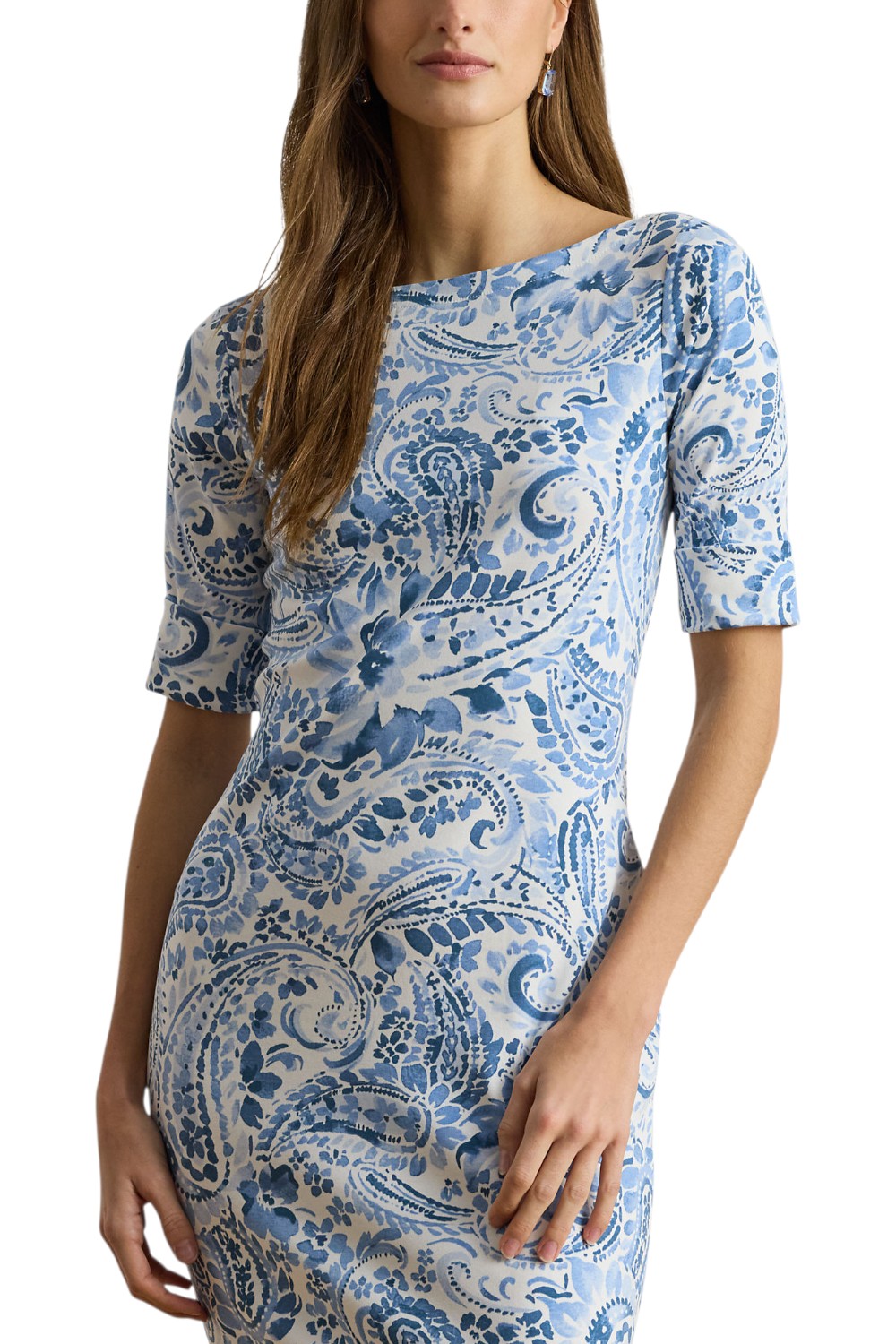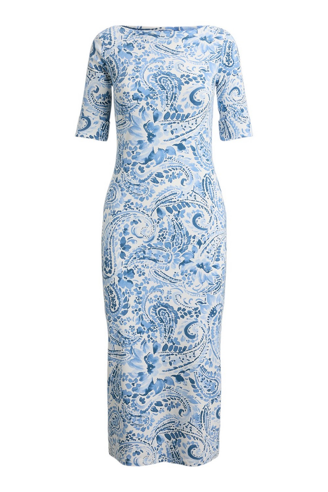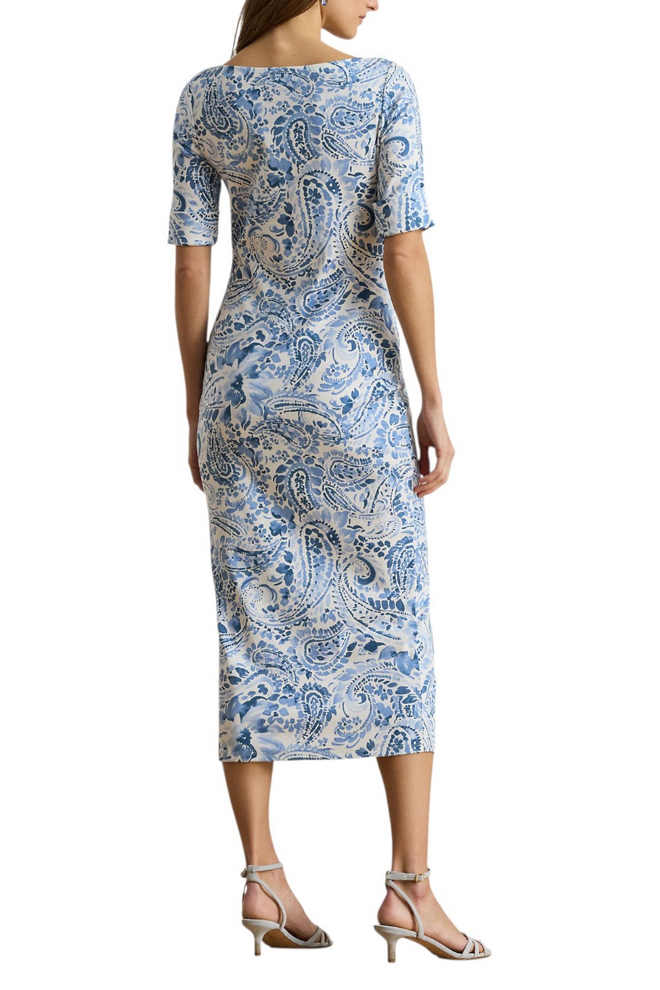 Abito di Ralph Laure realizzato in cotone elasticizzato a costine, midi con scollo a barchetta presenta un design aderente e il motivo paisley blu e bianco tipico della stagione. Vestibilità aderente. Lunghezza media al polpaccio. La taglia media ha una lunghezza del corpo di 116 cm e una lunghezza delle maniche di 28 cm. La lunghezza dell'abito è misurata dal punto più alto della spalla e varia di 1,3 cm tra una taglia e l'altra. La lunghezza delle maniche varia di 0,6 cm tra una taglia e l'altra. Scollo a barchetta. Modello da infilare. Maniche al gomito con polsini ripiegati. Sfoderato. 94% cotone, 6% elastan. Lavabile in lavatrice o a secco. Importato. La modella è alta 178 cm e indossa una taglia S.