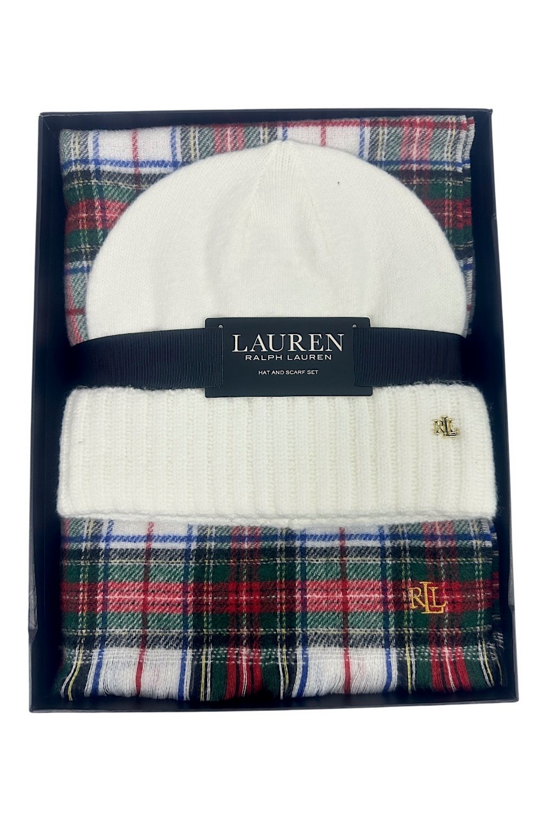 Set sciarpa e cappello Ralph Lauren. Sciarpa: 193 cm x 66 cm, frange alle estremità, logo"LRL" ricamato sull'orlo. Berretto: apertura inferiore di 23,5 cm, bordo a coste ripiegato, logo "LRL" in metallo lucido sul bordo. Composizione sciarpa: 85% poliestere, 15% lana. Composizione cappellino: 69% poliestere, 23% acrilico, 6% lana, 2% elastan.