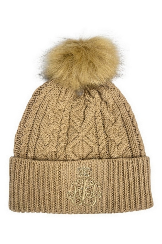 Cappello Ralph Lauren. Taglia unica. Bordo a coste ripiegato. Logo "LRL" ricamato in corsivo, decorato con strass e corona sul risvolto. Pompon in pelliccia ecologica sulla corona. Esterno: 48% poliestere, 17% lana, 13% nylon, 13% fibre metalliche, 9% cotone (escluse le decorazioni). Pompon in pelliccia sintetica: 100% acrilico.
