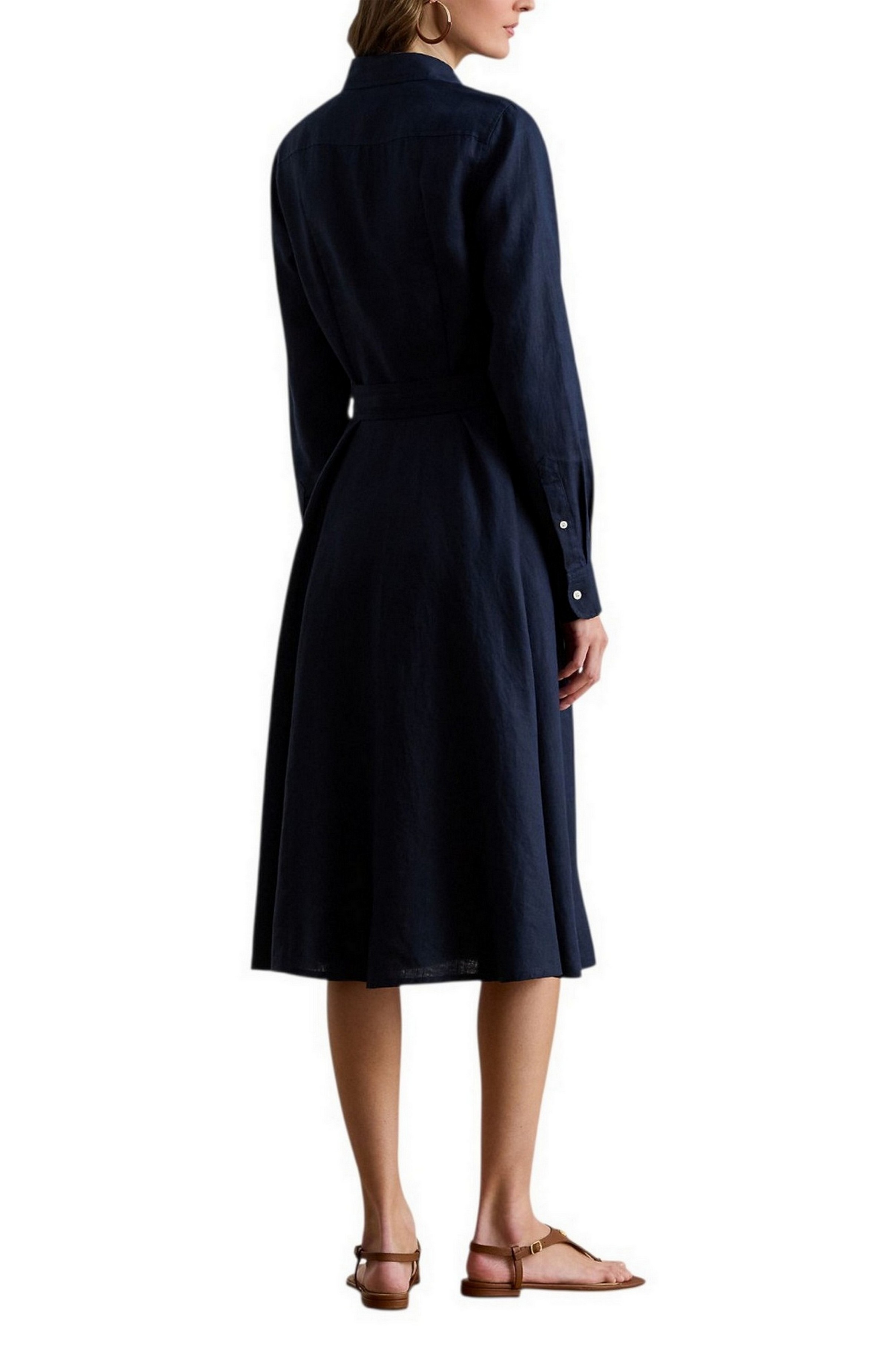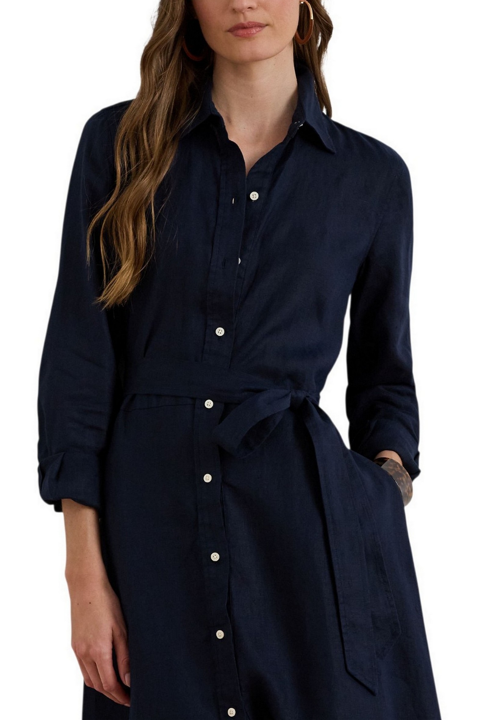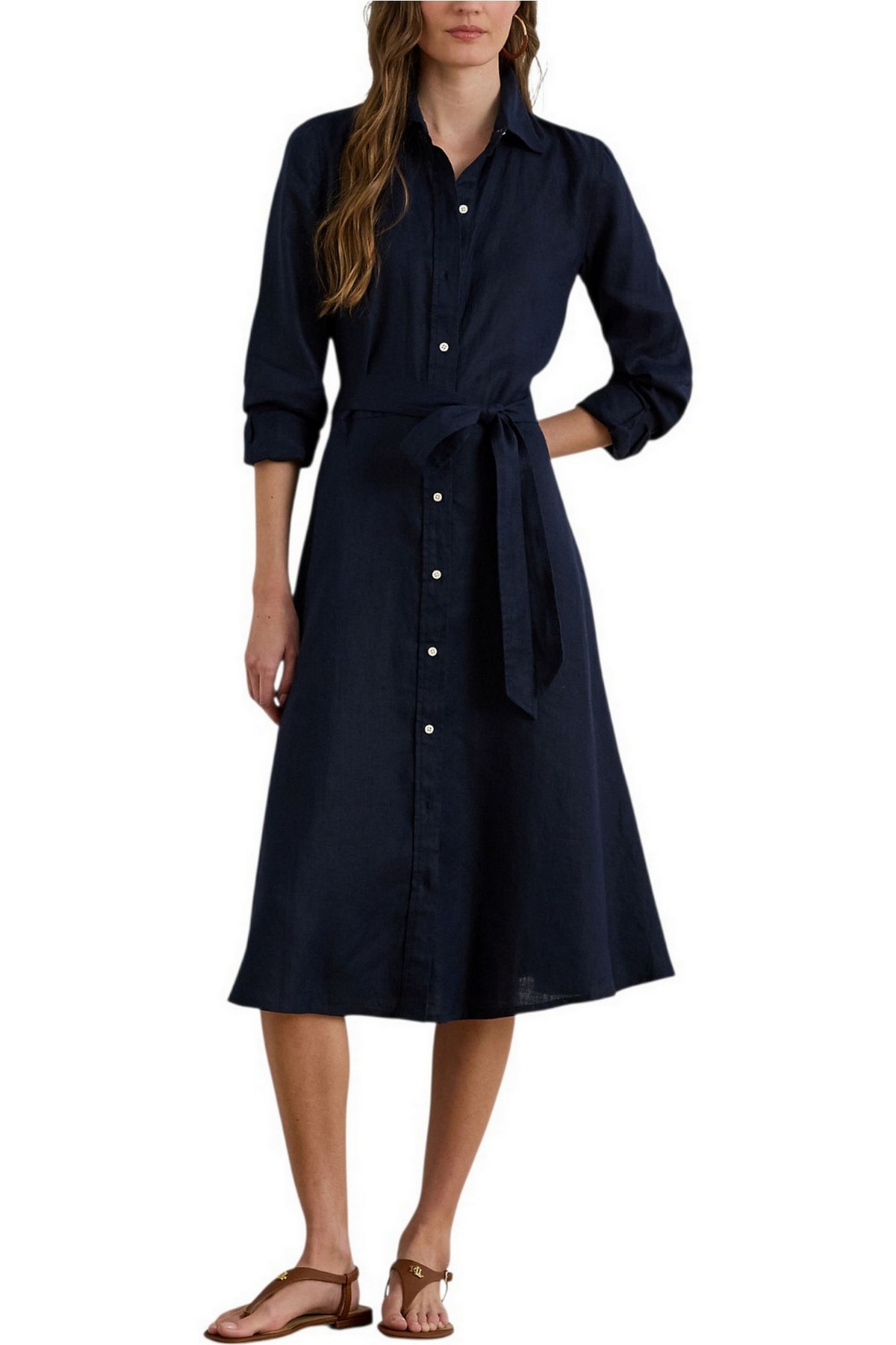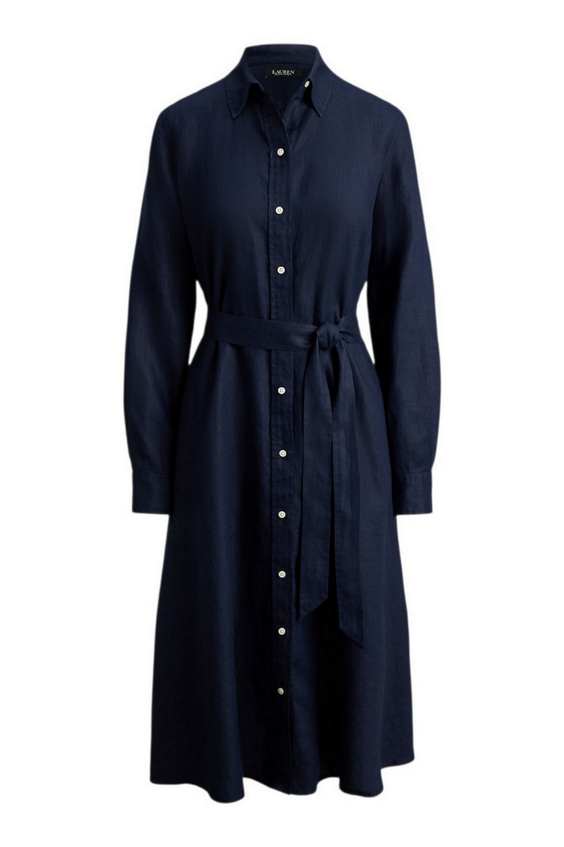 Iconico modello Lauren Ralph Lauren, questo abito chemisier presenta una silhouette svasata realizzata in lino leggero. La cintura integrata accentua il punto vita, mentre i bottoni con incisione "Lauren Ralph Lauren" aggiungono un tocco distintivo. Silhouette svasata. Lunghezza sotto il ginocchio. La taglia 8 americana ha una lunghezza del corpo di 113 cm e una lunghezza delle maniche di 82 cm. La lunghezza dell'abito e delle maniche è misurata dal centro della nuca. La lunghezza dell'abito varia di 1,3 cm tra una taglia e l'altra. La lunghezza delle maniche varia di 0,6 cm tra una taglia e l'altra. Colletto a punta. Abbottonatura con bottoni. Bottoni realizzati su misura con logo "Lauren Ralph Lauren". Maniche lunghe con polsini a barilotto abbottonati. Tasche laterali cucite. Cintura abbinata rimovibile. Pinces sul retro in vita. Carré sul retro. Senza fodera. 100% lino. Lavabile in lavatrice o a secco. La modella è alta 178 cm e indossa una taglia 4.
