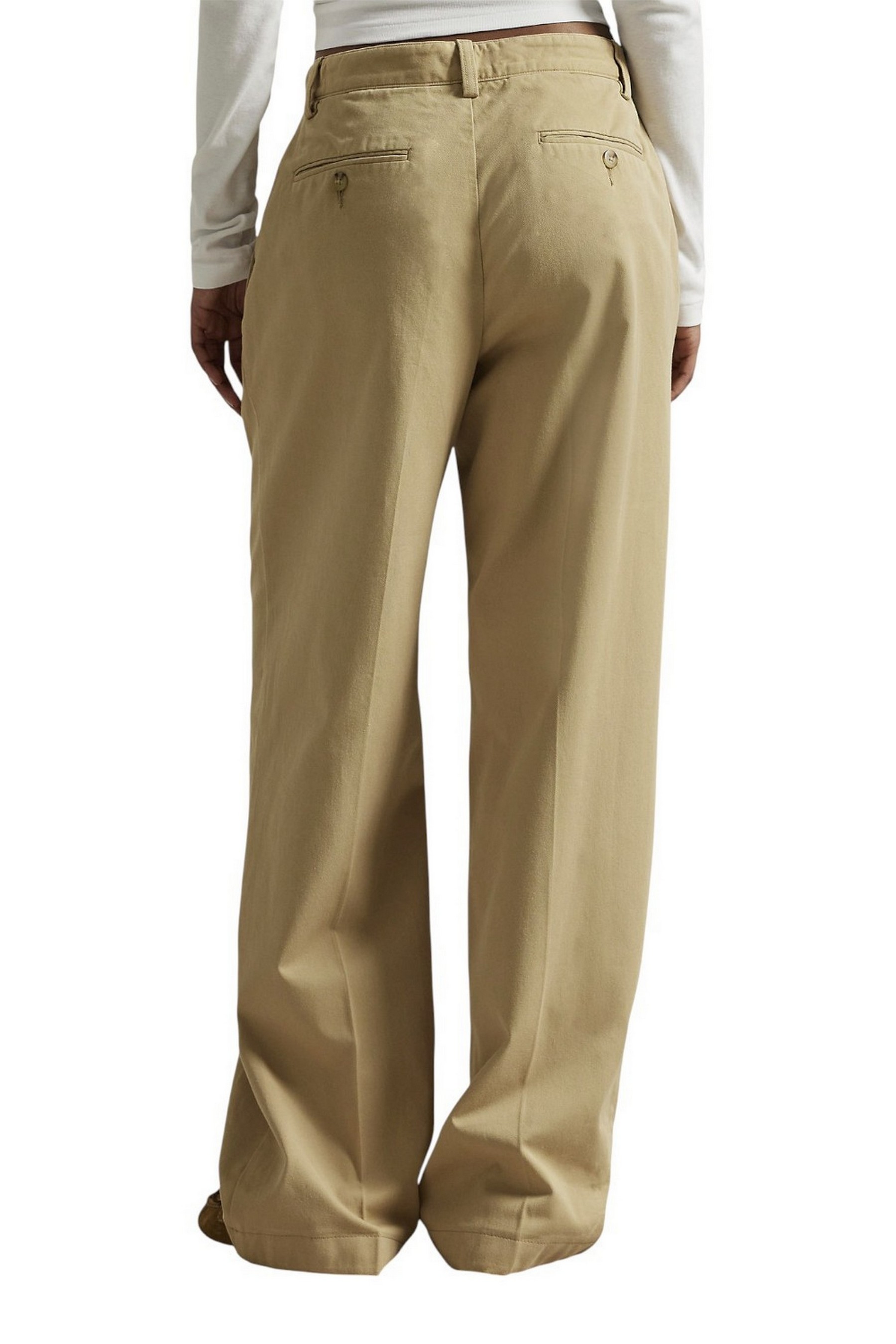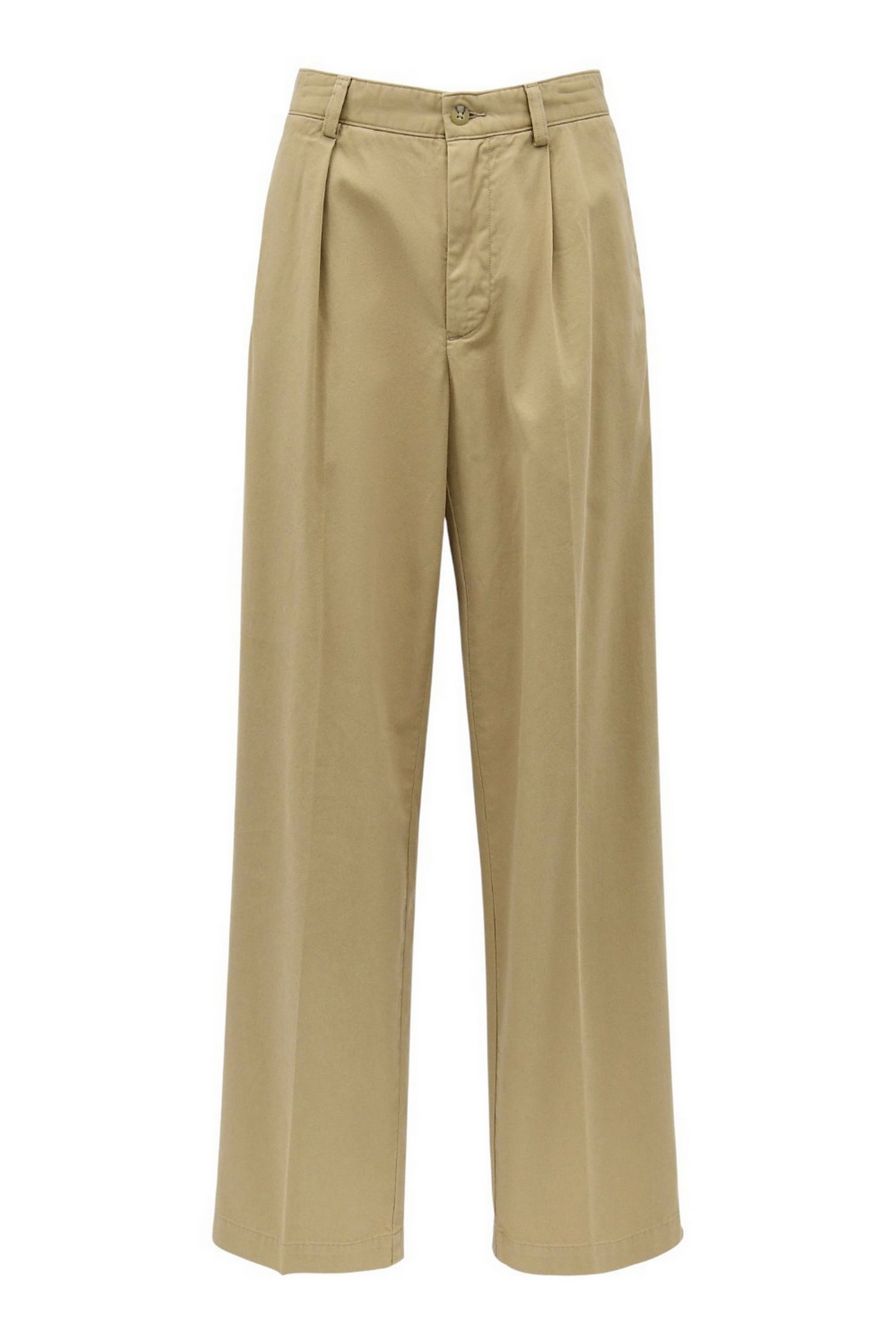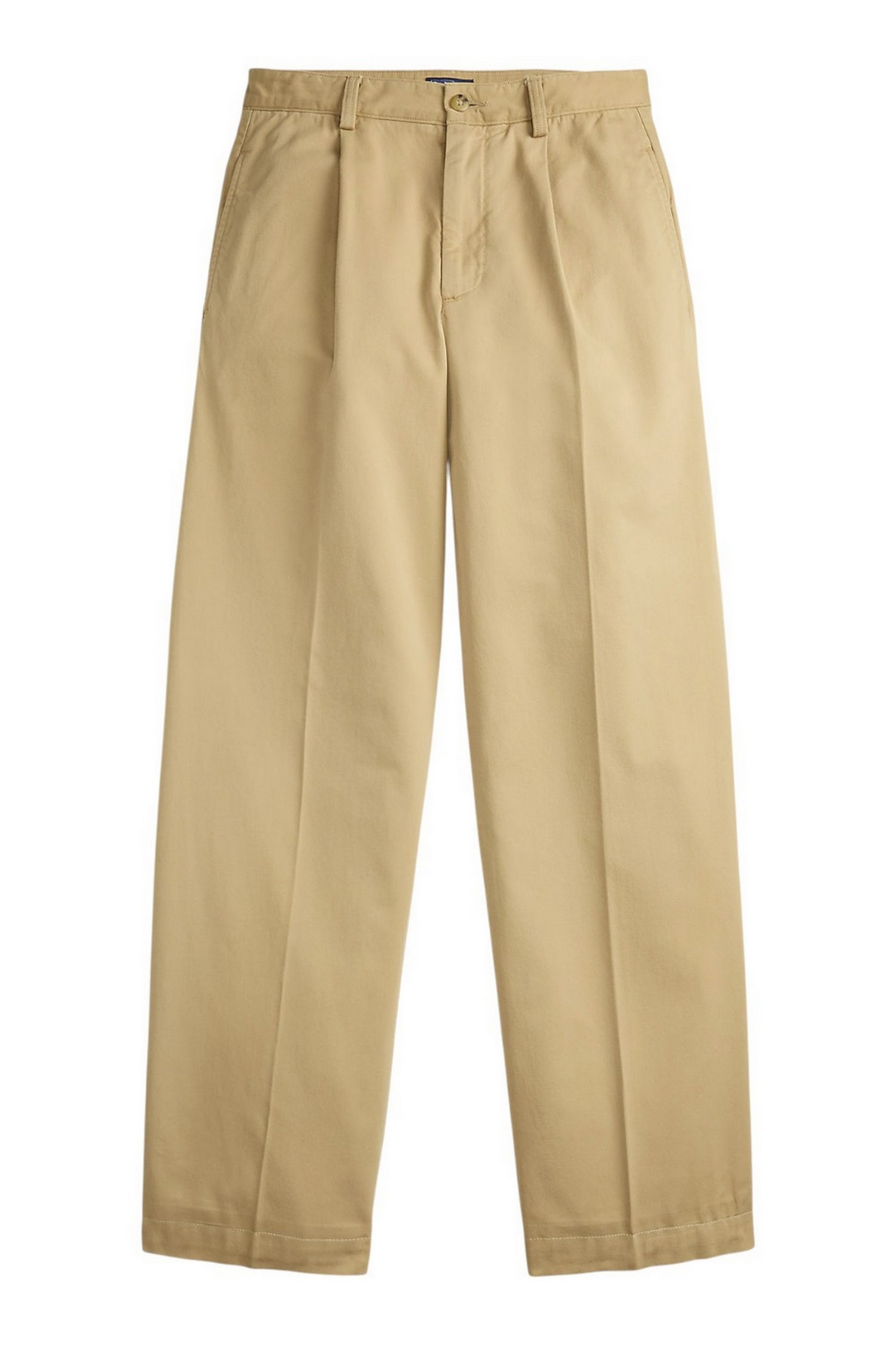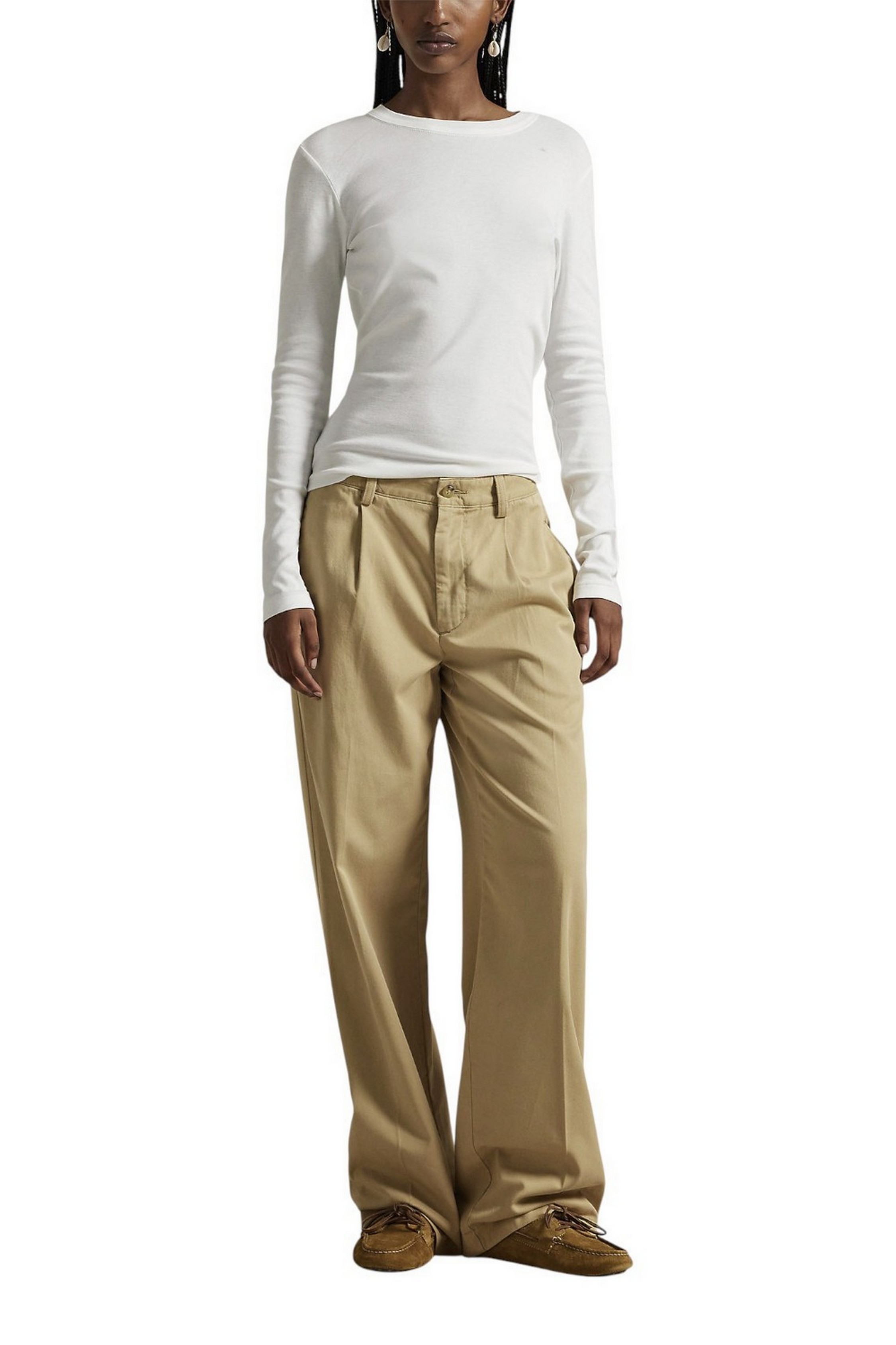 Pantaloni di peso medio di Ralph Lauren. Caratterizzati da una silhouette morbida, sono realizzati in twill di cotone, che bilancia la morbidezza al tatto con la struttura. Presentano dettagli ispirati all'abbigliamento maschile, tra cui vita a pieghe, tasche posteriori a filetto e pieghe lucide. Vita alta. Vestibilità morbida. Lunghezza sotto la caviglia. La taglia 8 americana ha un cavallo di 26 cm e un'apertura della gamba di 50 cm. Tutte le taglie hanno un cavallo di 81 cm. Passanti per cintura. Chiusura con zip e bottone. Tasche laterali sulla cucitura. Due tasche posteriori con bottone. Vita con pinces sul davanti. Pince posteriori in vita. Pieghe lungo la parte anteriore e posteriore di ciascuna gamba. Corpo: 70% cotone. 30% lyocell. Lavabile in lavatrice o a secco. La modella è alta 178 cm e indossa una taglia 4 americana.