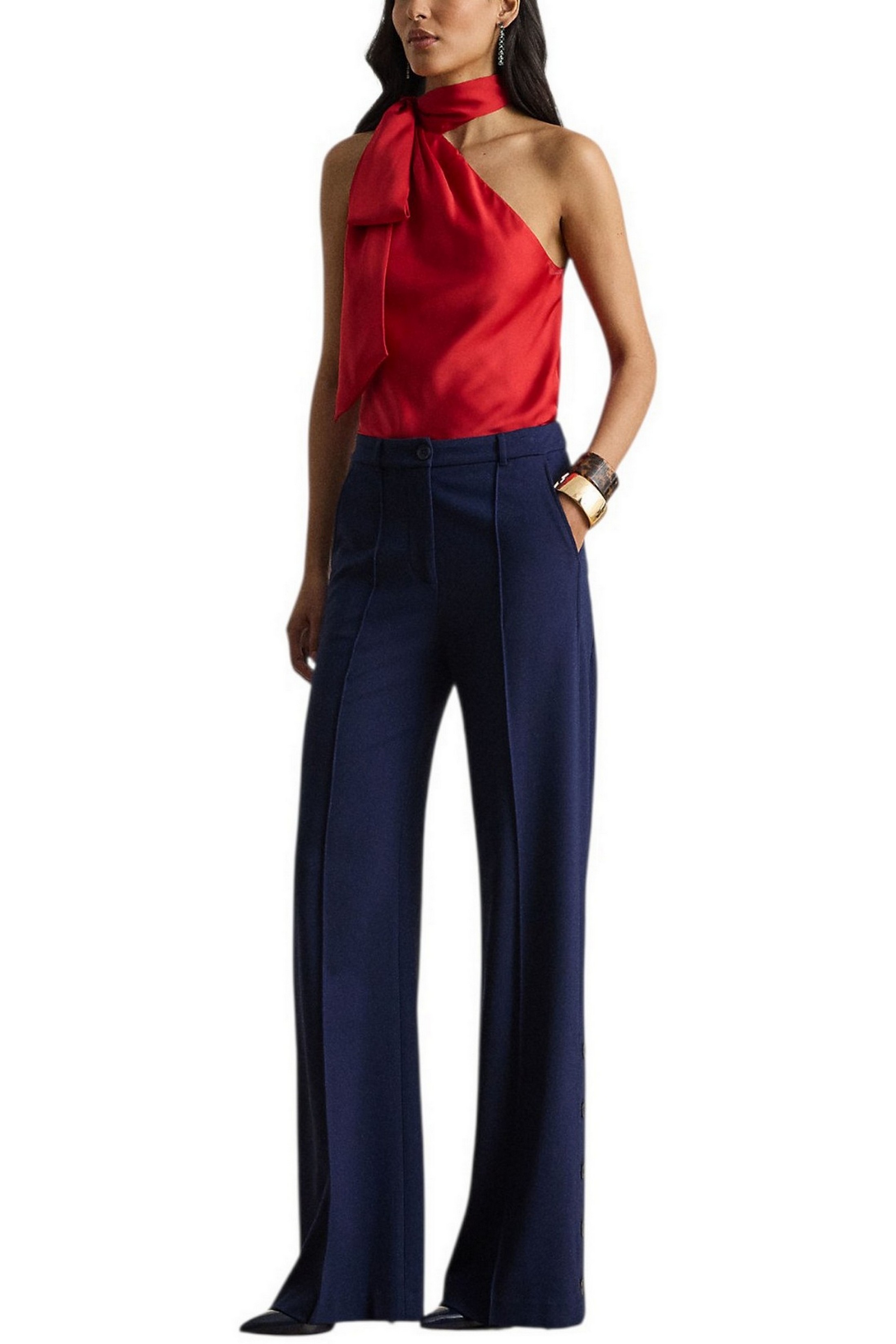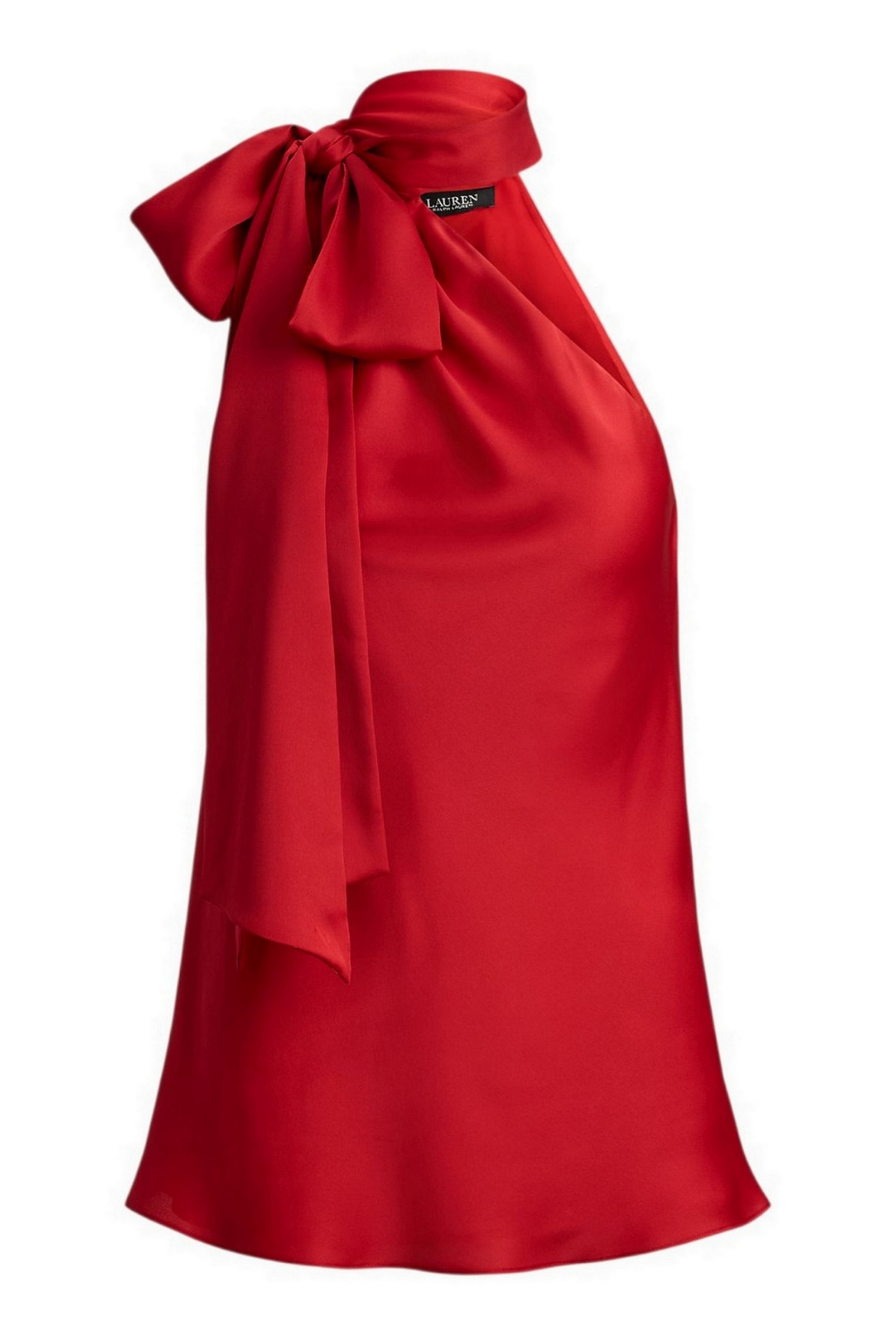 Realizzato in charmeuse leggerissima per una splendida lucentezza, questo elegante top di Ralph Lauren con scollo all'americana è rifinito con un fluido dettaglio annodato sul collo. Vestibilità morbida. Lunghezza prevista sui fianchi. Silhouette con scollo all'americana e chiusura con gancio e occhiello sulla spalla destra. Nodo sul collo. Silhouette senza maniche. Pieghe sul davanti che si raccolgono nella scollatura. Fodera intera in georgette. Esterno e fodera: 100% poliestere. Lavabile in lavatrice o a secco. La modella è alta 178 cm e indossa una taglia 4.