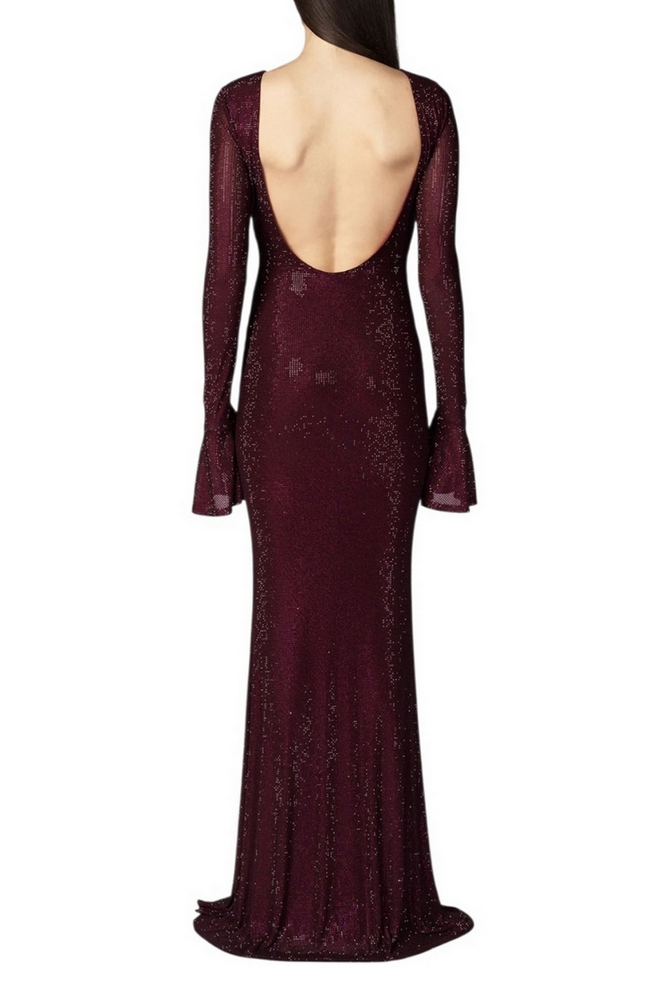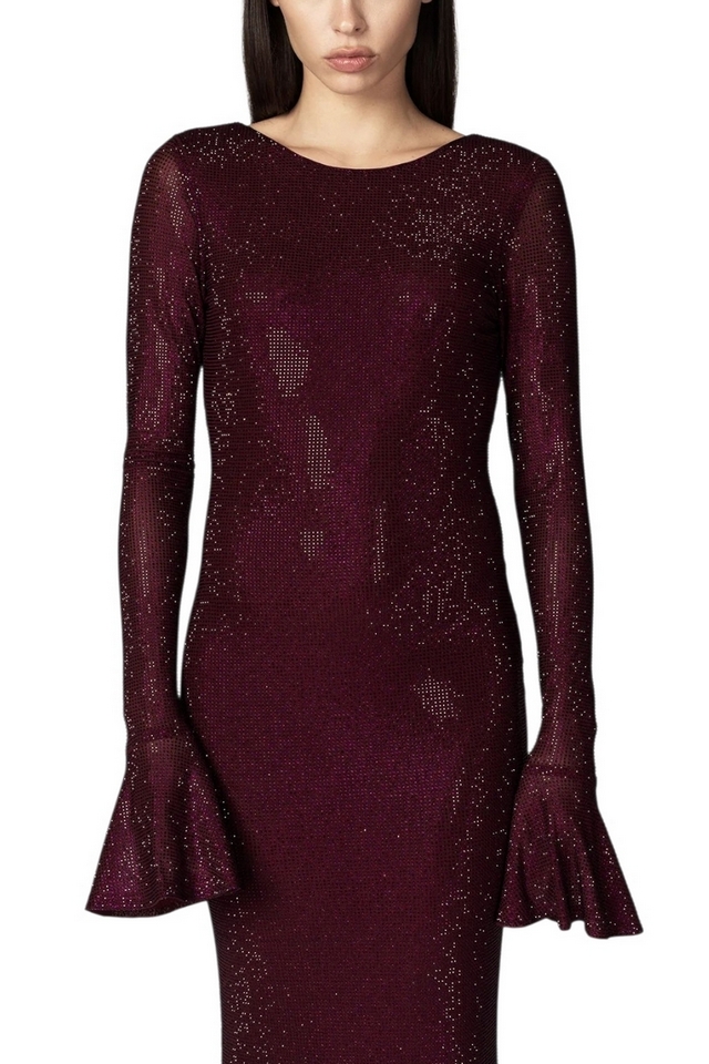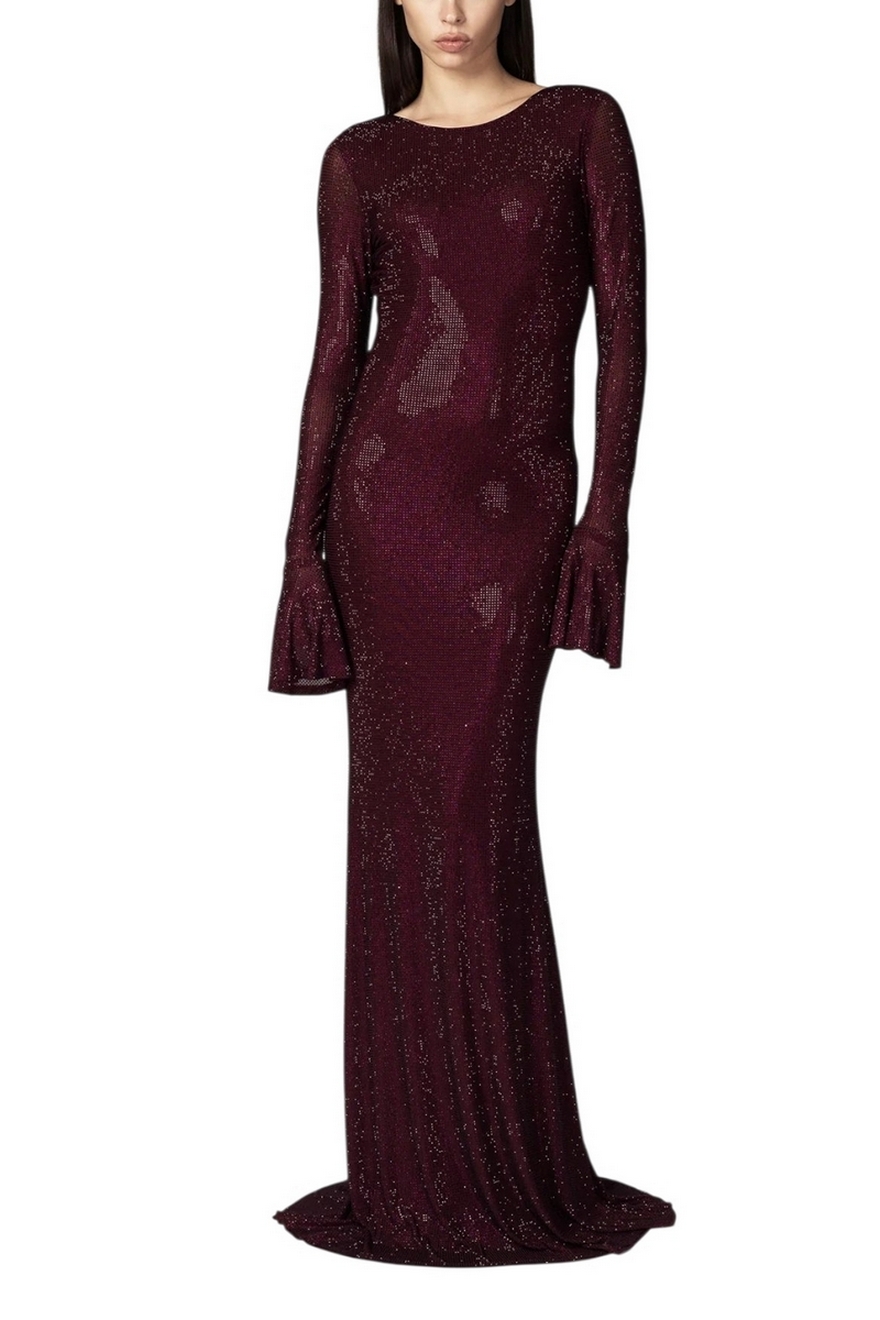 Abito lungo di Twentyfourhaitch in tulle stretch, dalla linea sirena che scolpisce la figura con eleganza. Interamente ricoperto di strass, crea un effetto luminoso e avvolgente. Lo scollo profondo sul retro e le maniche lunghe svasate donano movimento e femminilità a un look dallimpatto scenico. Composizione: 100% poliestere. Fodera: 100% poliestere. La modella è alta 171 cm e indossa la taglia 40.