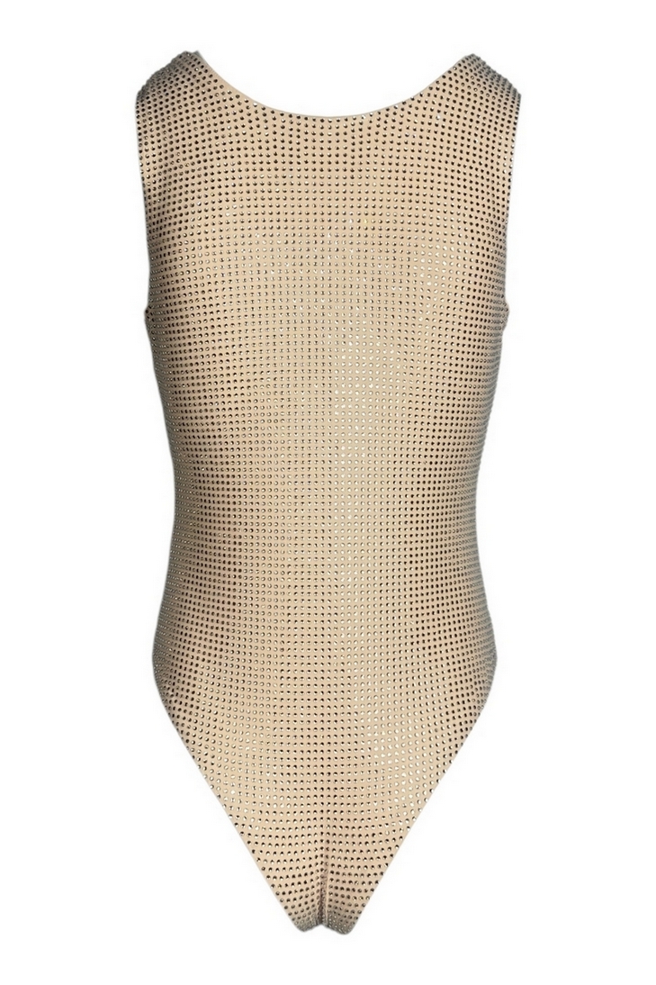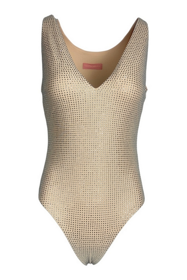 Body di Twenty Fourhaitch modello New Urano. Scollo a v. Tessuto elastico ricoperto di strass. Abbottonatura con ganci. Vestibilità regolare.