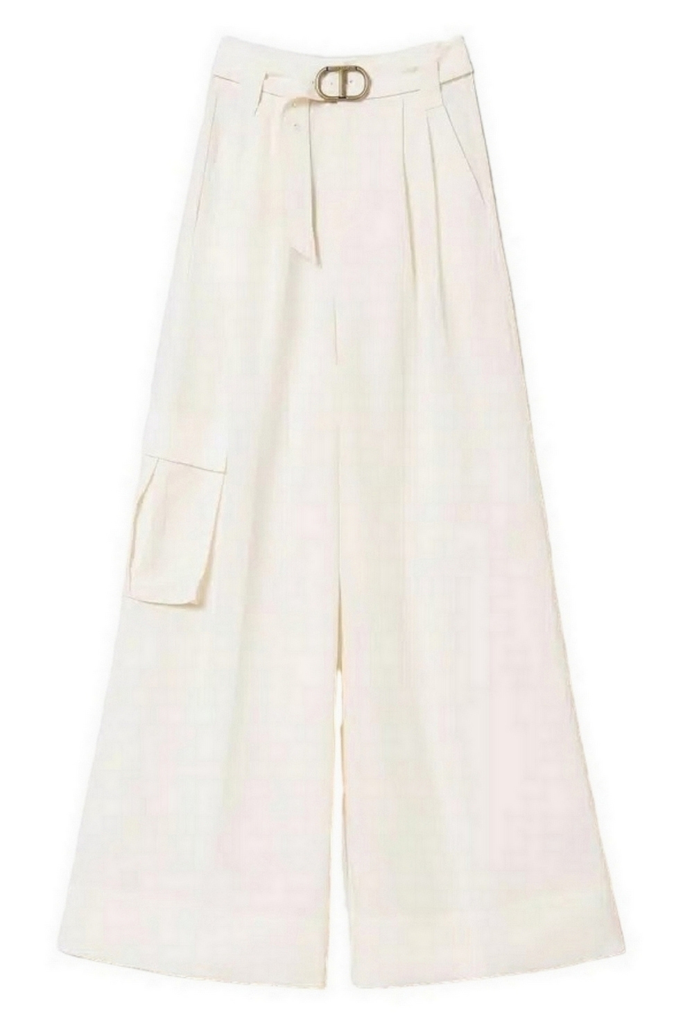 Pantaloni wide leg di Twin-set in tela di misto lino con pieghe davanti, tasche alla francese e a toppa sul fianco, cintura abbinata.Tela di misto lino e lyocell dalla mano morbida. Vita alta, pieghe davanti, tasche alla francese ai fianchi e a toppa sul fianco, chiusura con zip, cintura abbinata in tessuto con occhielli ricamati a filo e fibbia in metallo con logo Oval T. Composizione: 75% lyocell 25% lino. Fodera: 100% cotone. Cintura: 75% lyocell 25% lino