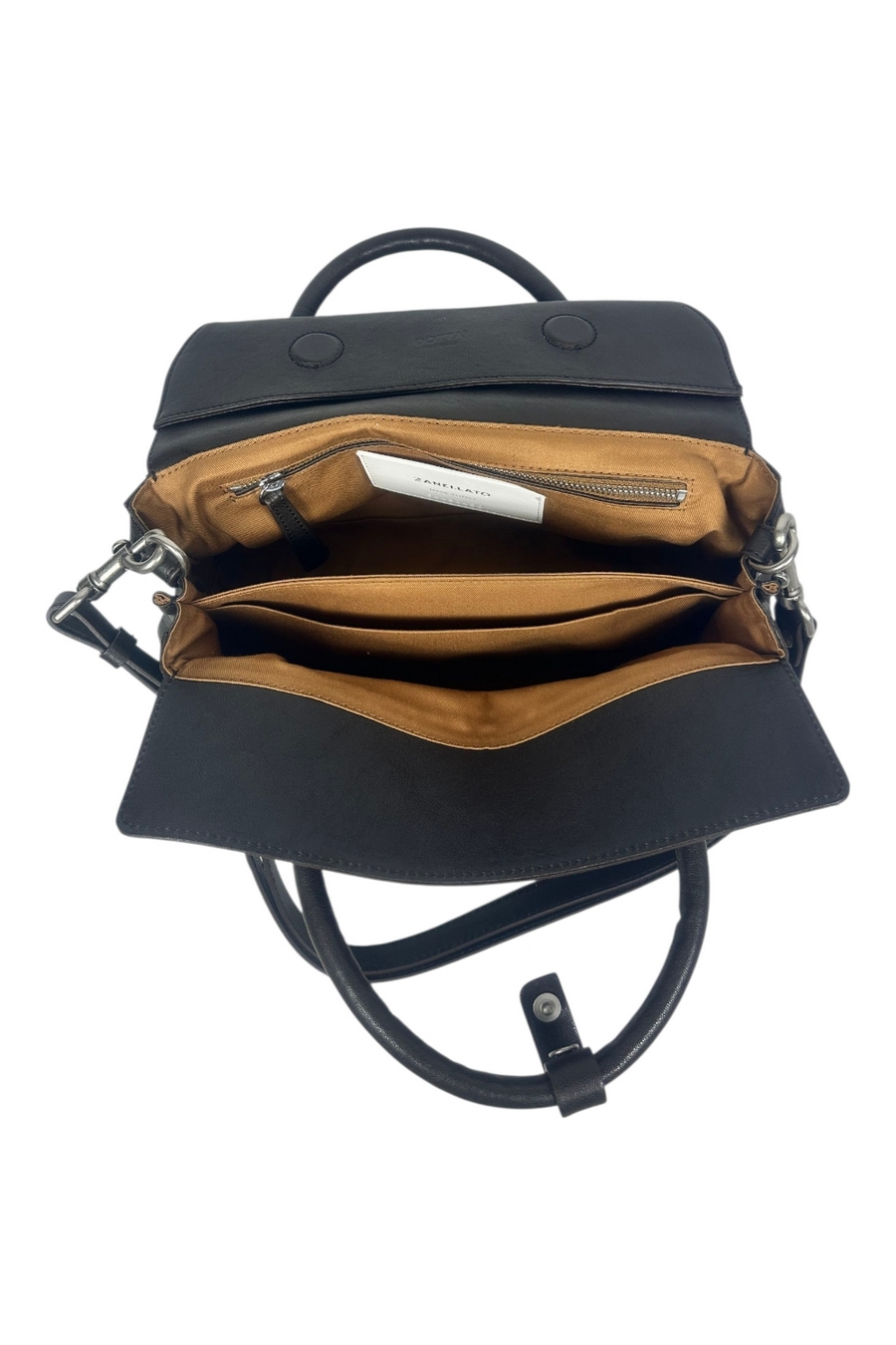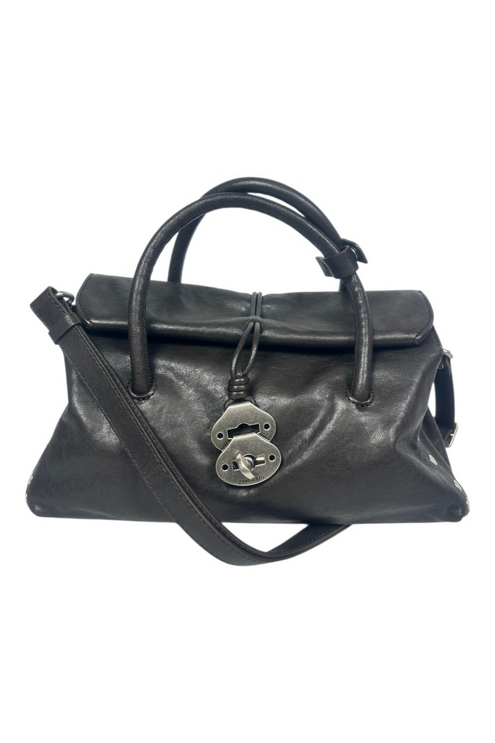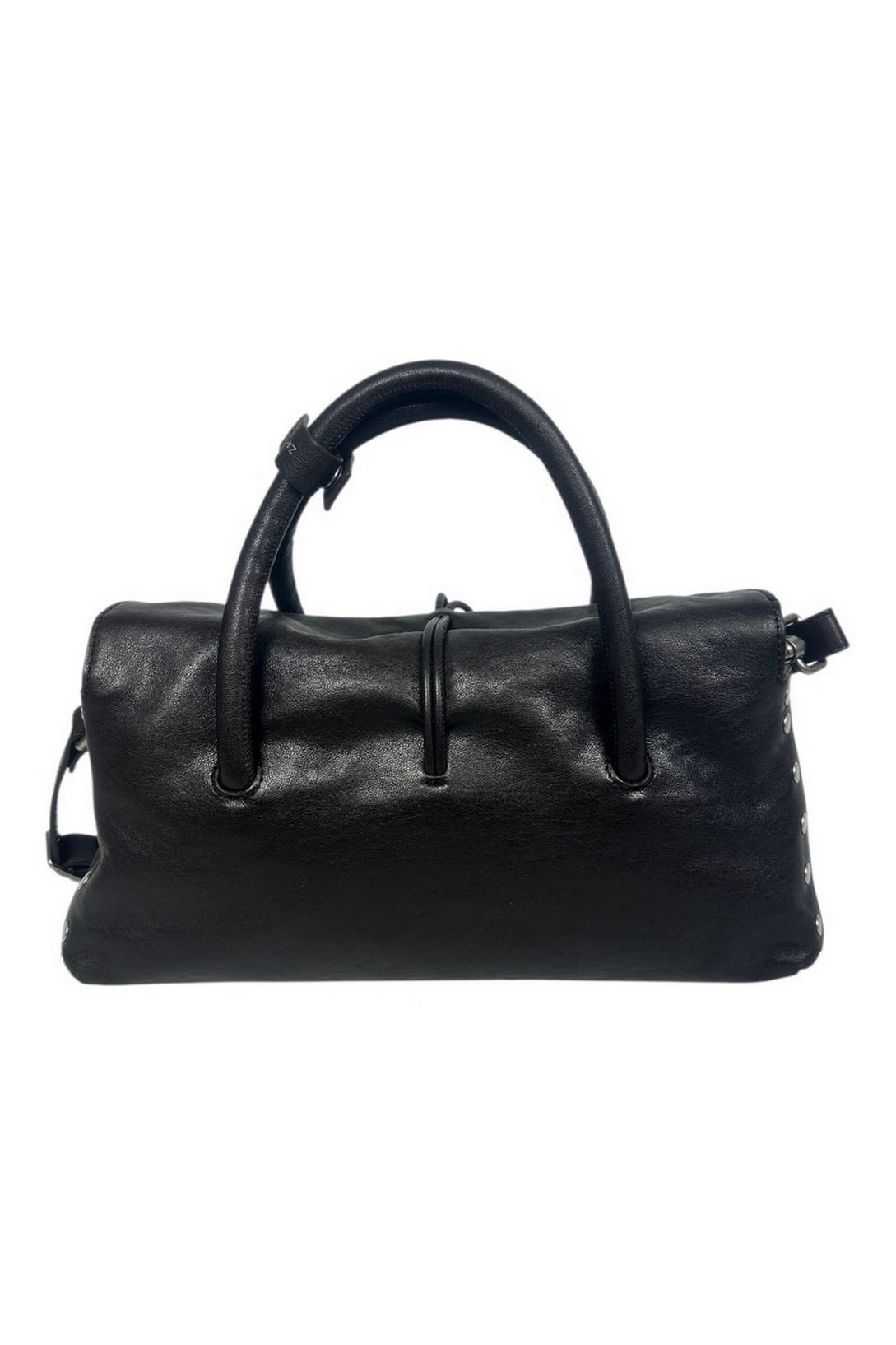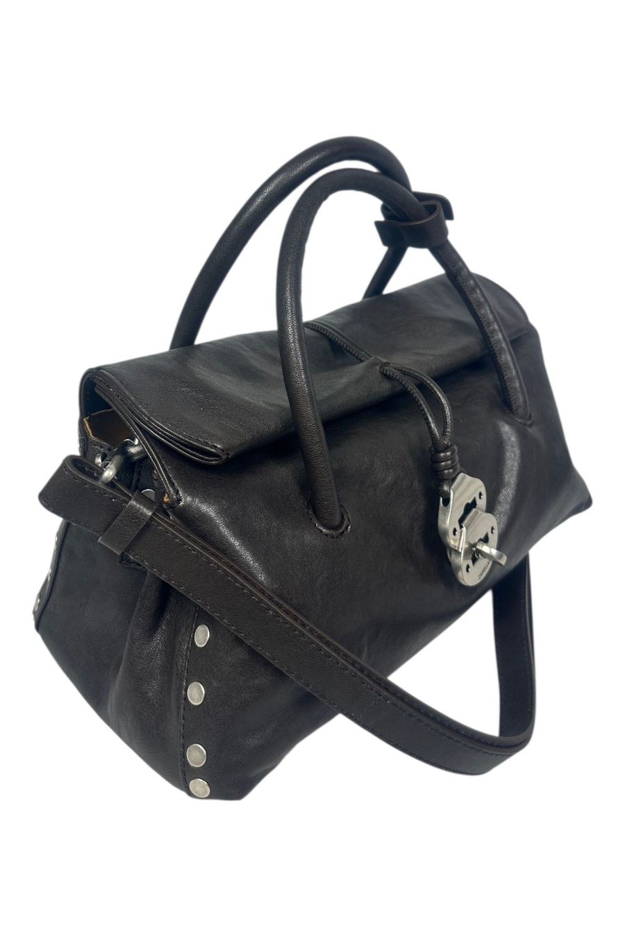 Borsa a Mano di Zanellato modello Dotta in pelle tabacco. Chiusura roll-top magnetica e nastrini tubolari con fibbia twist-lock, tracolla regolabile ed amovibile, lavorazione pelle liscia, internamente presenta due tasche multiuso di cui una zippata e due scomparti, borchie a vista metalliche, fondo con piedini. Composizione: 100% pelle. Made In Italy. Misure cm 32x17x16, luce manico cm 16
